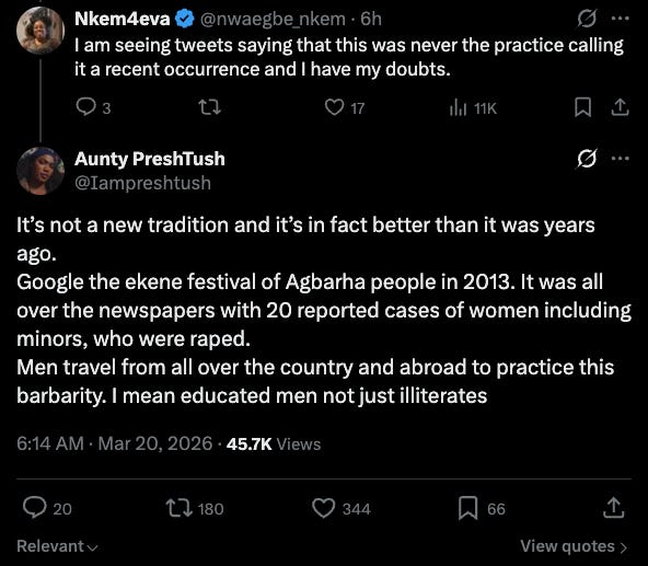 As I write presently, in Ozoro, Delta State, Nigeria, Isoko and Urhobo men have declared a seven day moratorium on women coming outside after 12pm for their Uruamudhu Aluejo Festival, and are gang raping any women and girls they find outside.